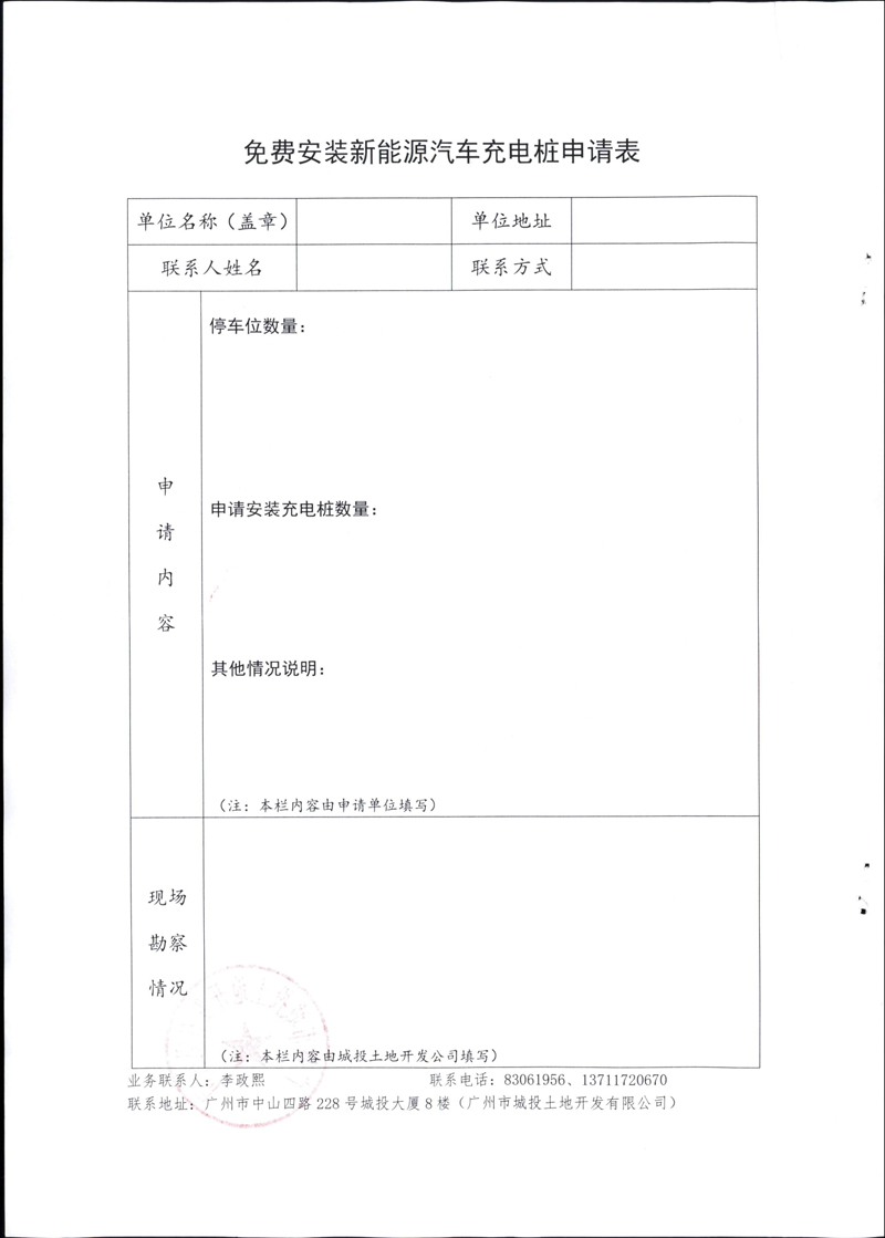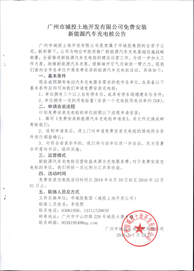 广州市城投土地开发有限公司免费安装新能源汽车充电桩的公告