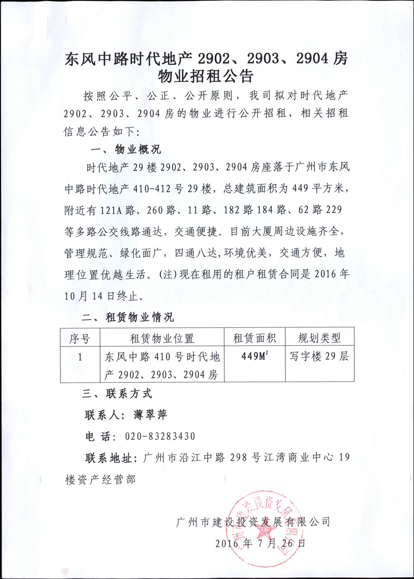 时代地产29楼2902、2903、2904房物业招租公告