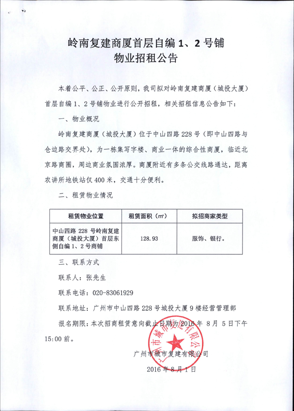 岭南复建商厦首层自编1、2号铺物业招租公告