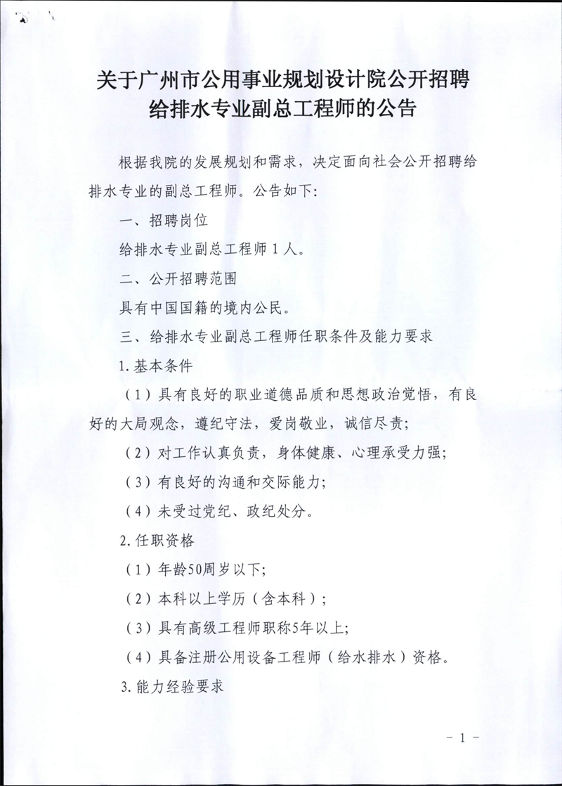 关于广州市公用事业规划设计院公开招聘给排水专业副总工程师的公告