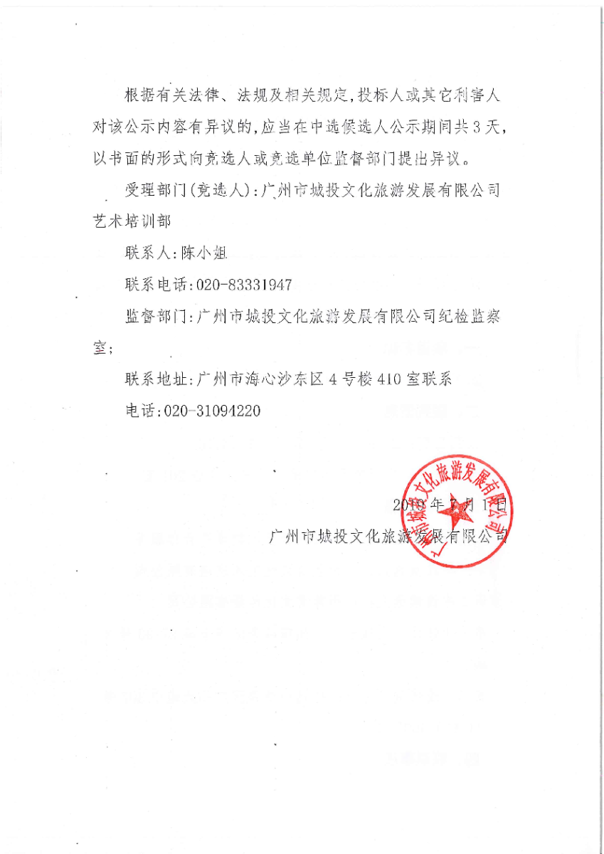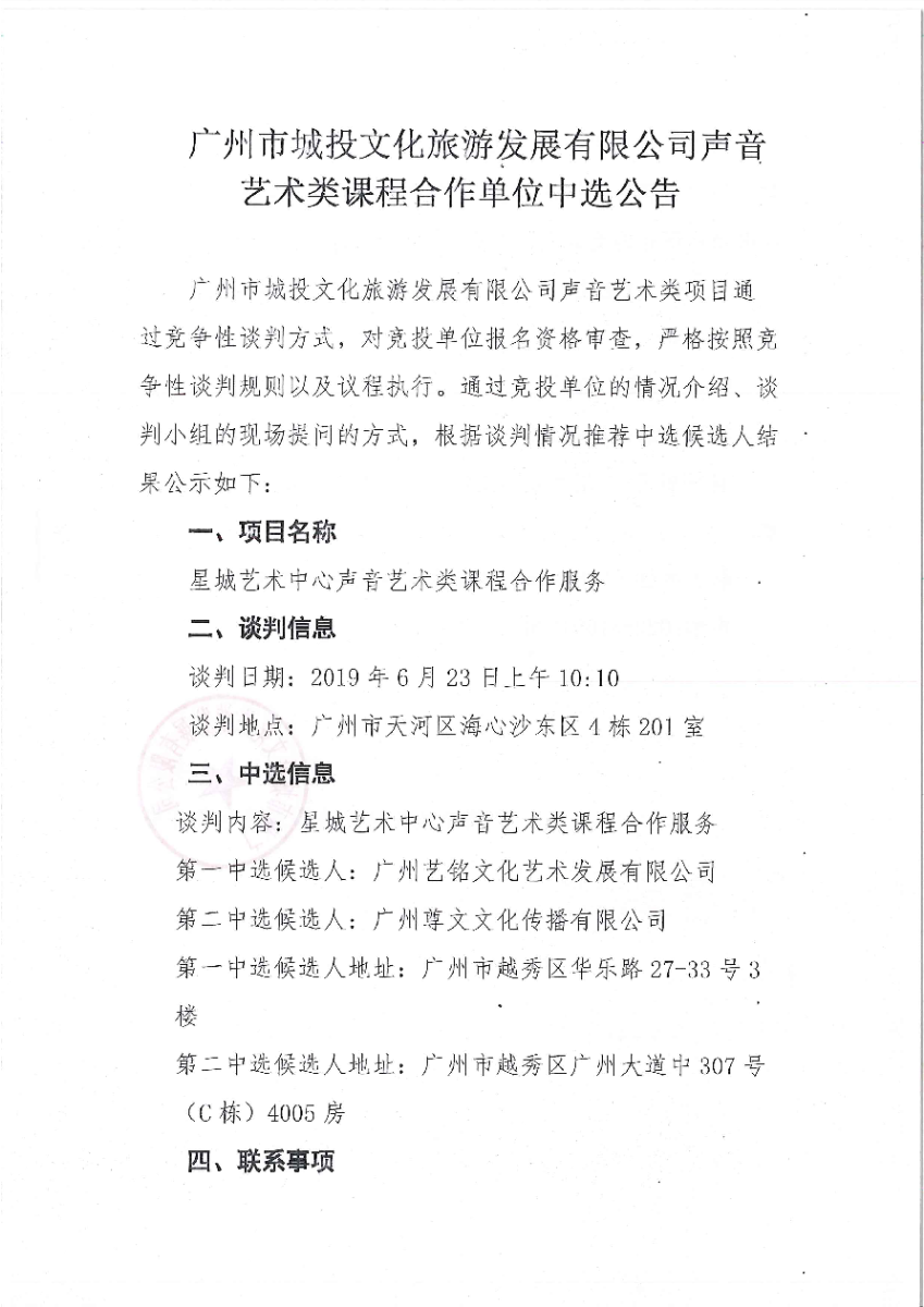 广州市城投文化旅游发展有限公司声音艺术类课程合作单位中选公告