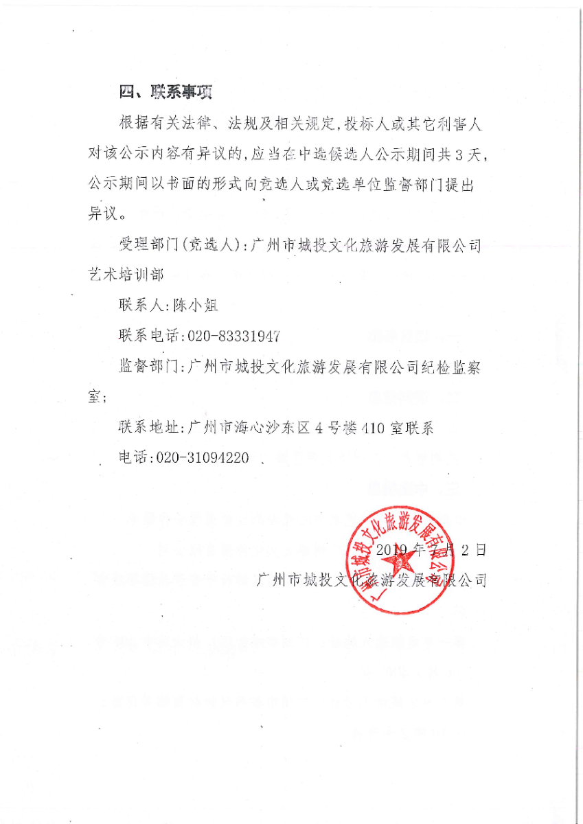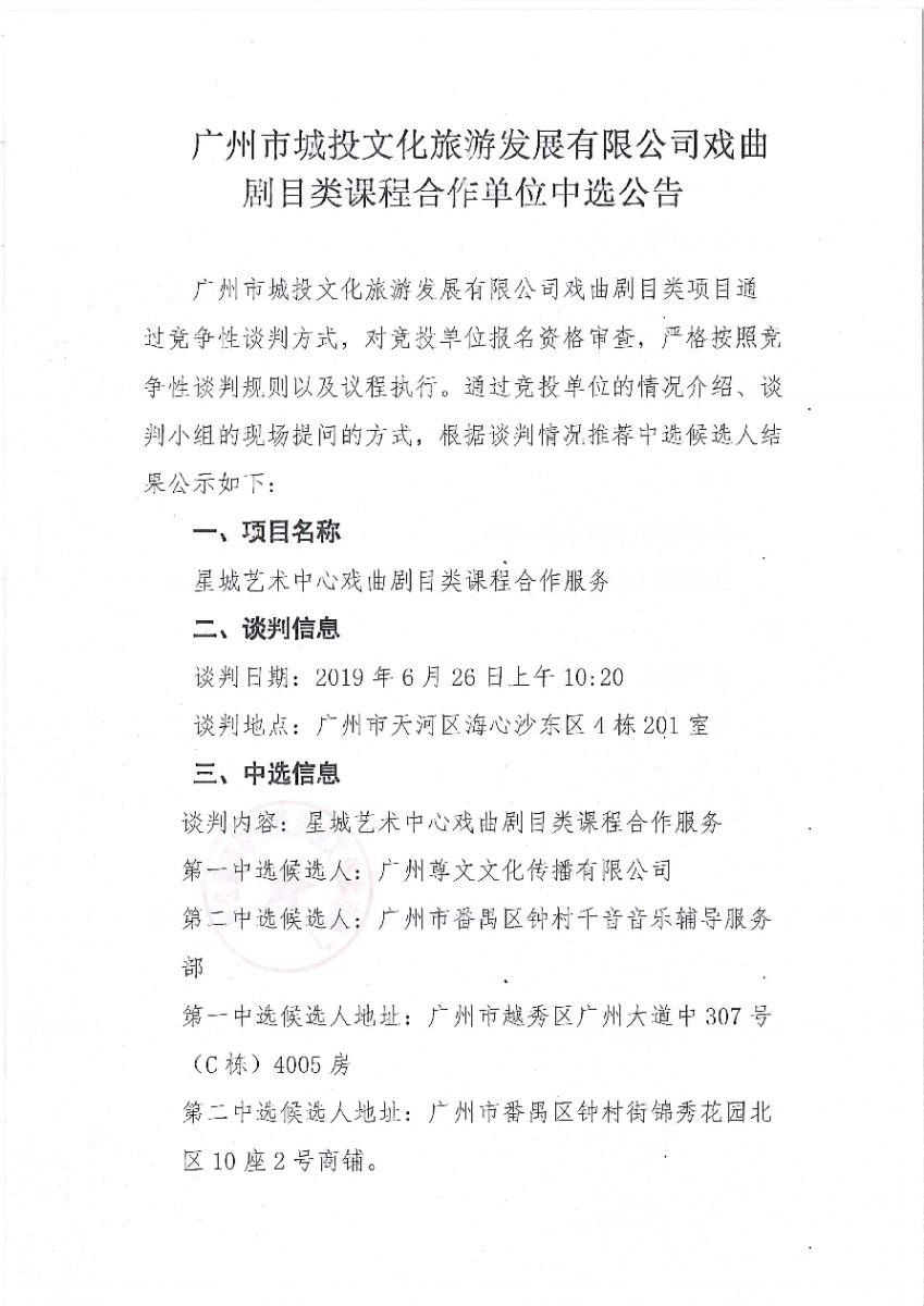 广州市城投文化旅游发展有限公司戏曲剧目类课程合作单位中选公告