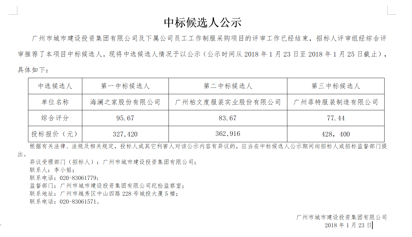 关于申请发布江南官方网页版及下属公司员工工作制服采购项目中标候选人公示的函